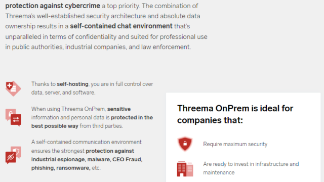 Threema OnPrem je řešení pro zasílání zpráv pro organizace, které berou soukromí a bezpečnost dat velmi vážně a pro které je ochrana před kybernetickou kriminalitou nejvyšší prioritou. Výsledkem kombinace dobře zavedené bezpečnostní architektury Threema a absolutního vlastnictví dat je samostatné chatovací prostředí, které je z hlediska důvěrnosti bezkonkurenční a vhodné pro profesionální použití v orgánech veřejné správy, průmyslových podnicích a orgánech činných v trestním řízení. – Threema